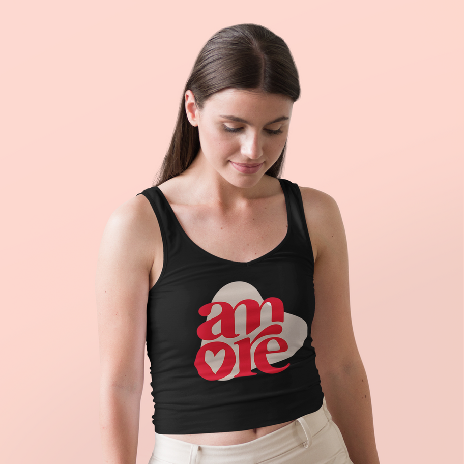 Crop top featuring “Amore” in striking red accompanied by a subtle heart detail. Made from soft, breathable cotton, it offers a stylish, modern look ideal for casual and chic outfits.