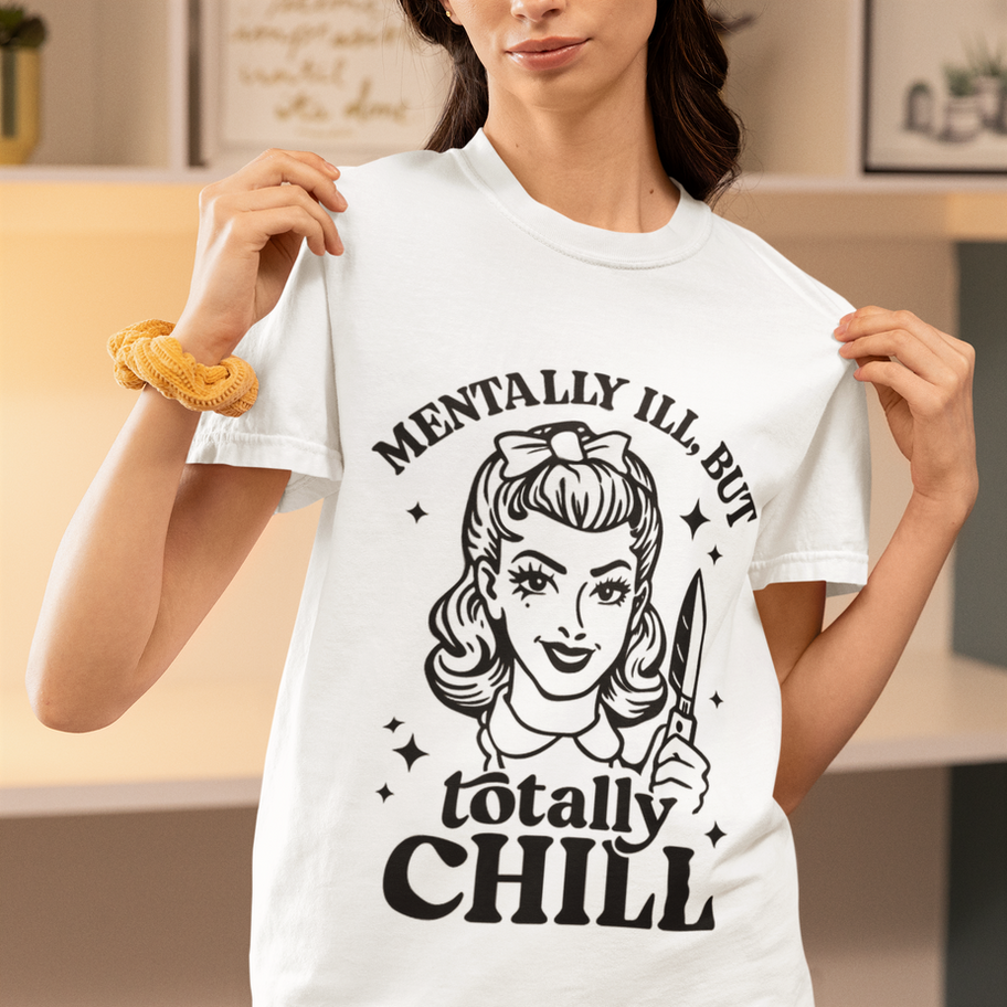 Classic crew tee featuring a girl illustration paired with the phrase “Mentally Ill” in a chill, stylish design. Soft, breathable cotton ensures comfort while making a fun, casual streetwear statement